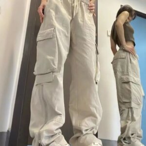 Deeptown Y2k Big Pocket Cargo Pants Women Streetwear Straight Wide Leg Trousers Vintage Design Side Zipper Drawtring Baggy Pants