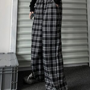Jmprs Oversize Women Sweatpants Summer Fashion Black Plaid Casual Pants Elastic Waist Casual Pockets Student Trousers