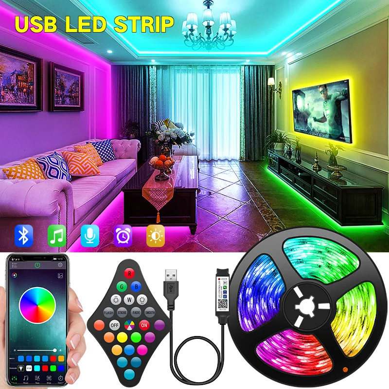 1M-30M USB LED Strip Lights 5050 RGB APP Control Color Changing Lights with 24 Keys Remote Mode for Room Decoration Bluetooth TV