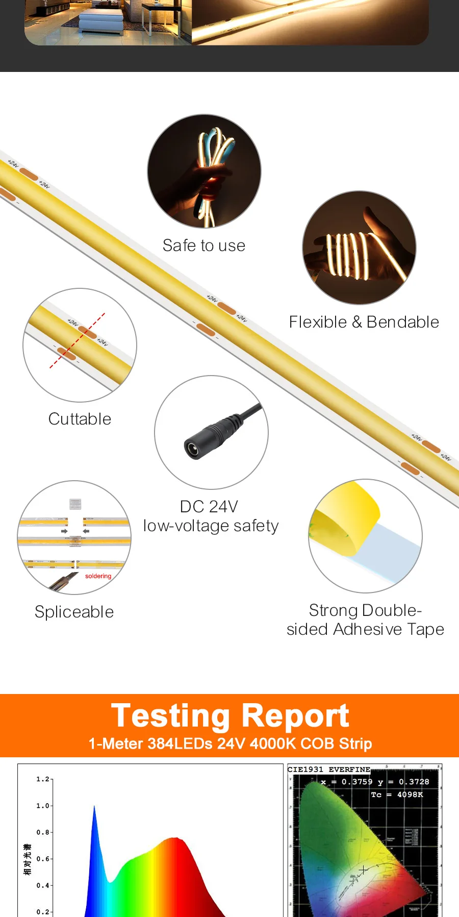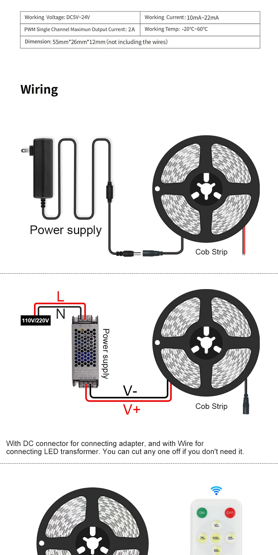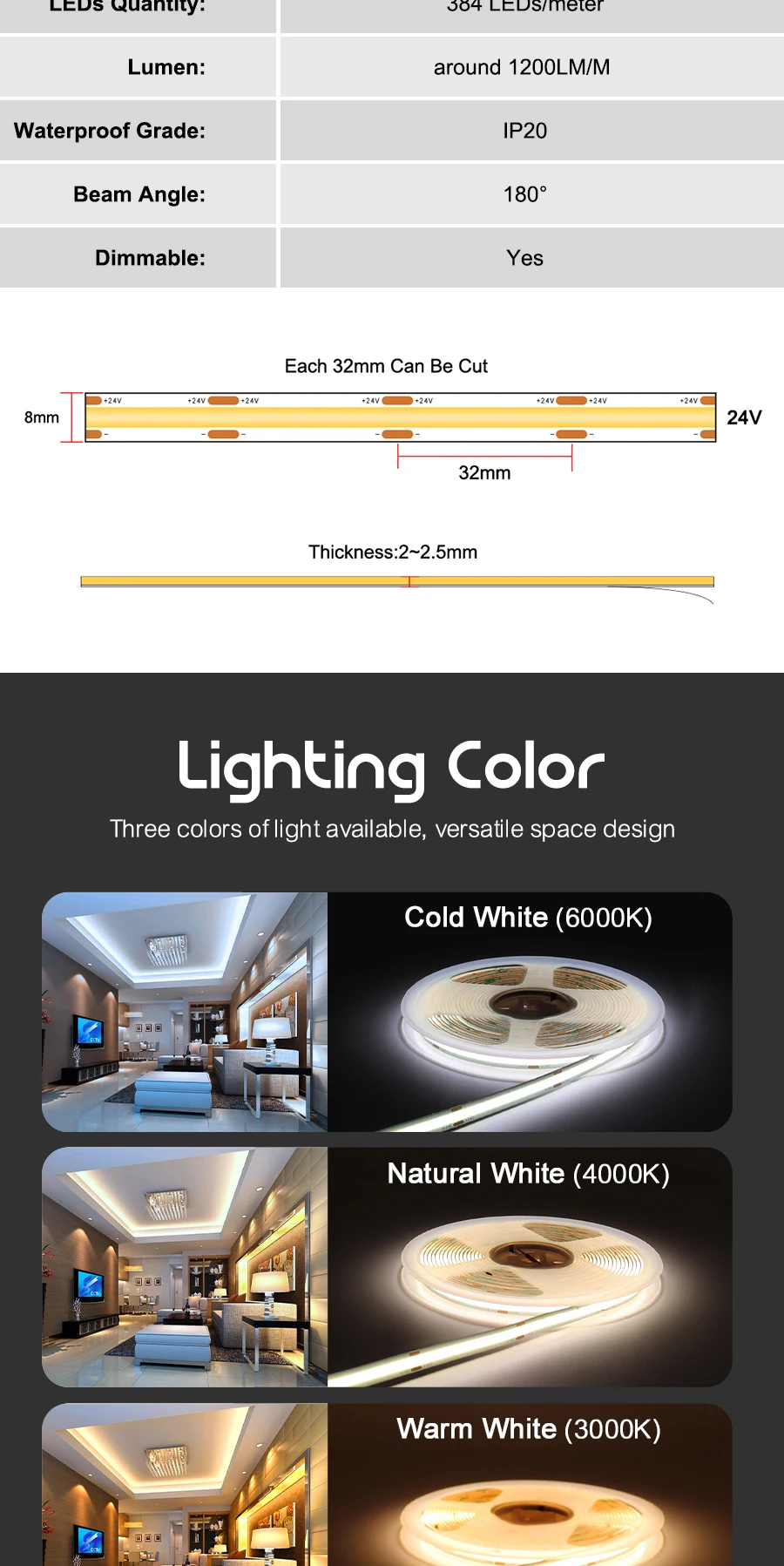 1. The COB LED strip cannot be connected to 110V or 220V directly, must add the 24V power supply.