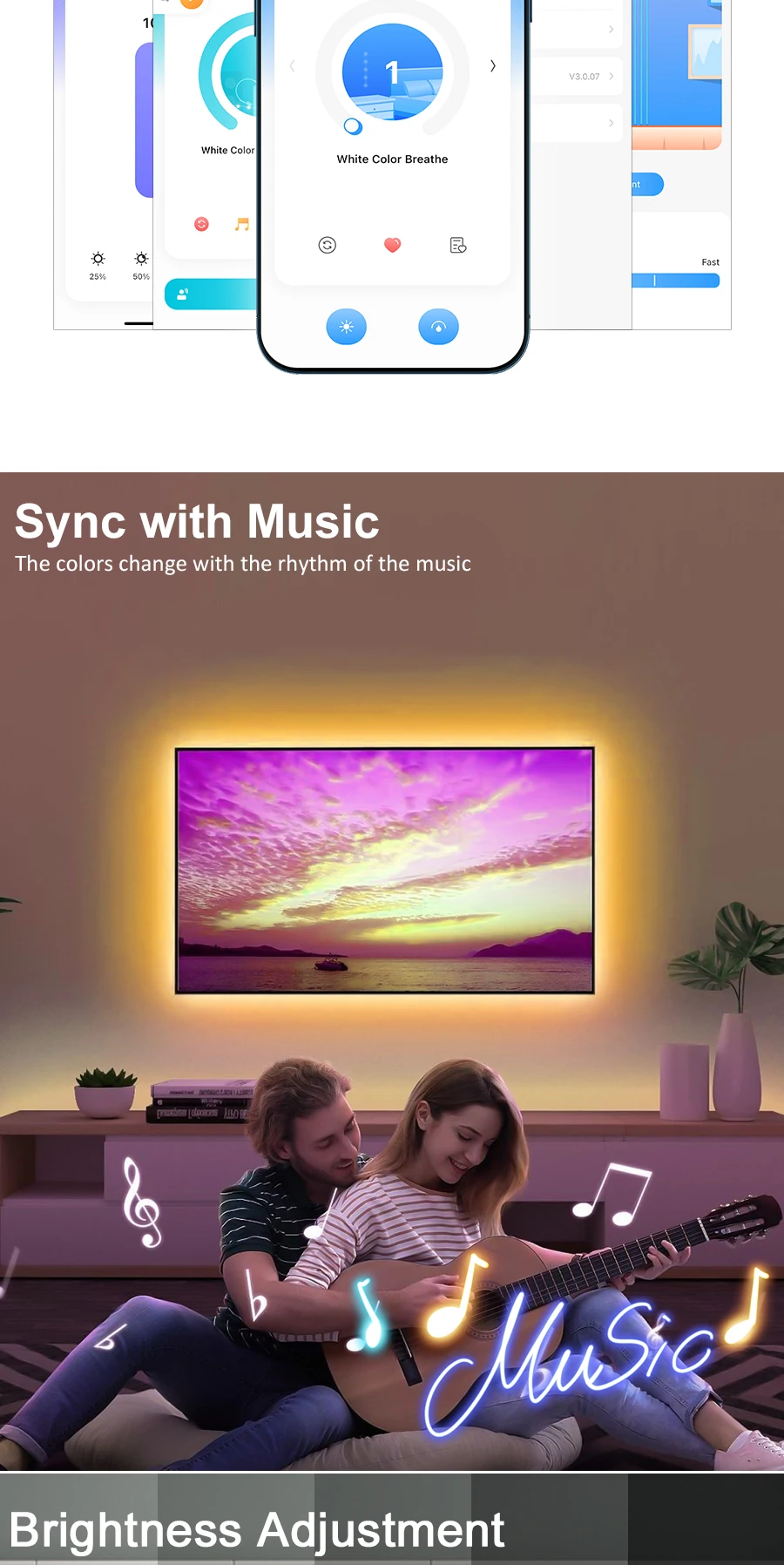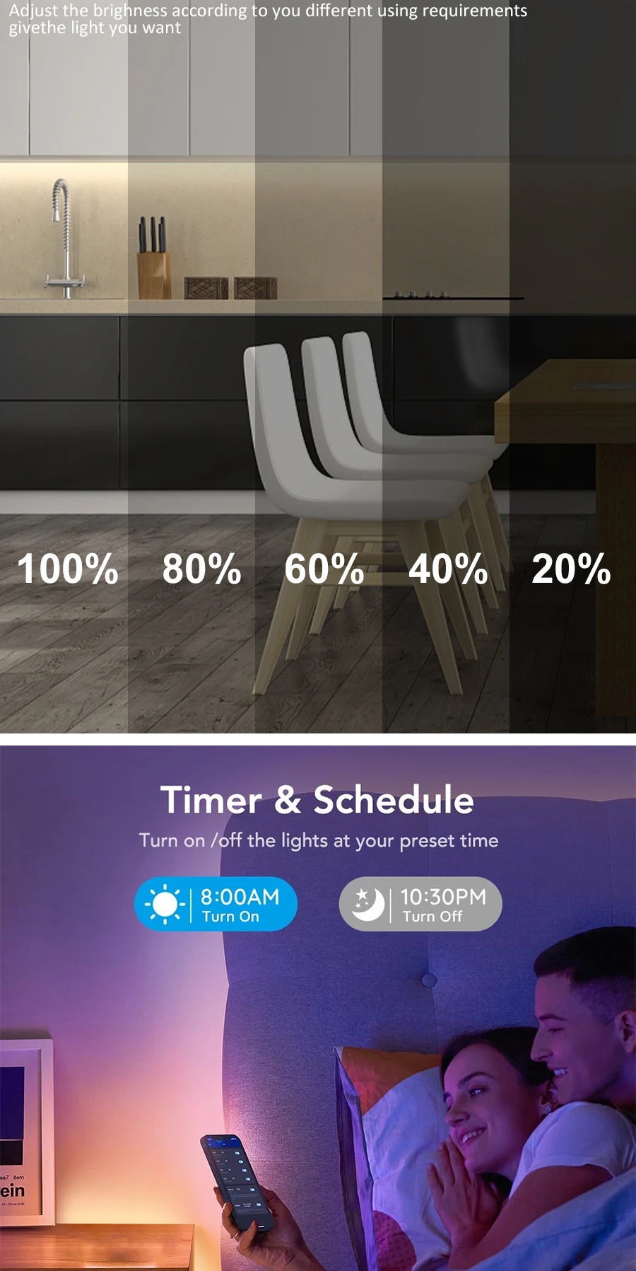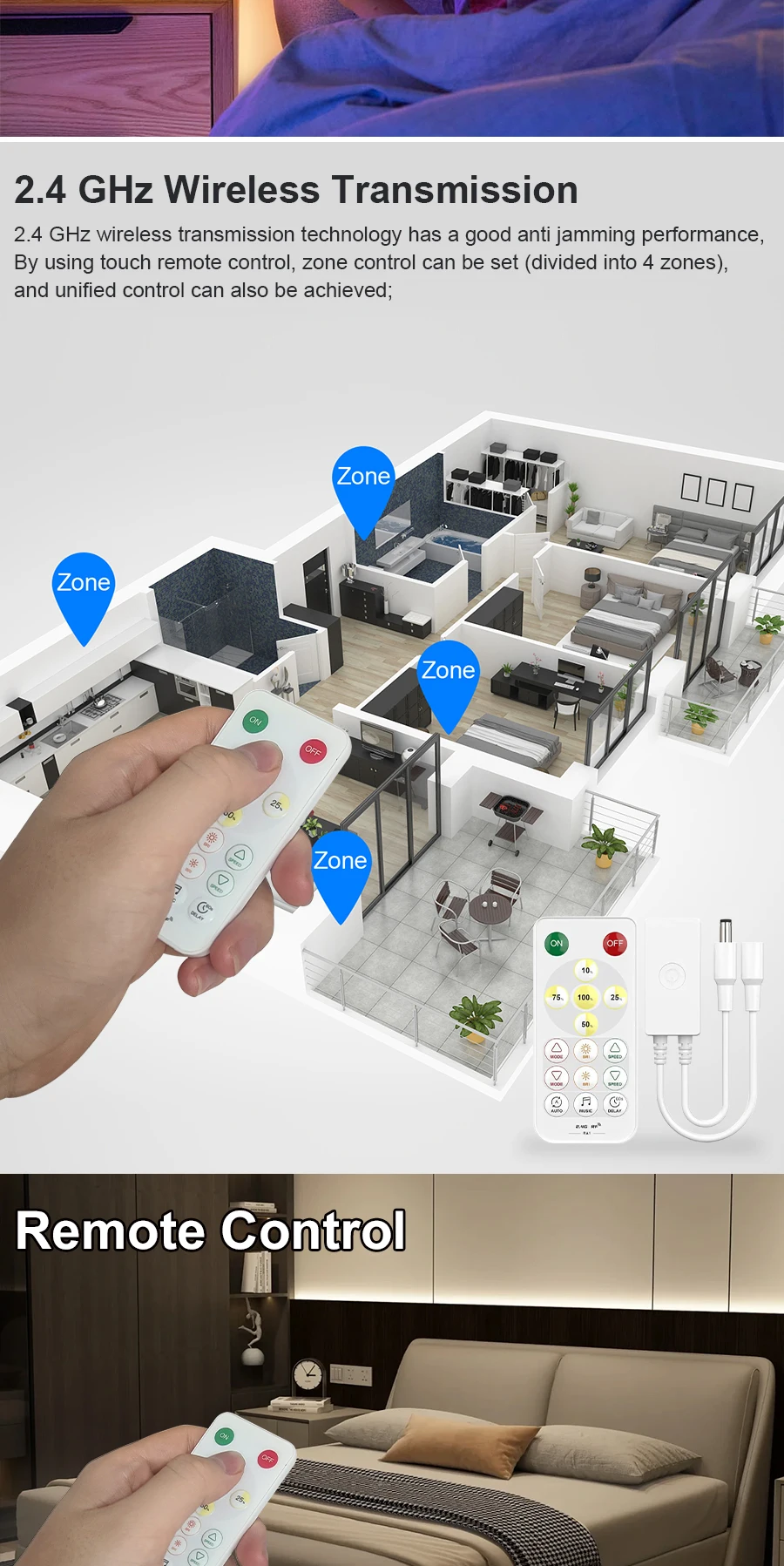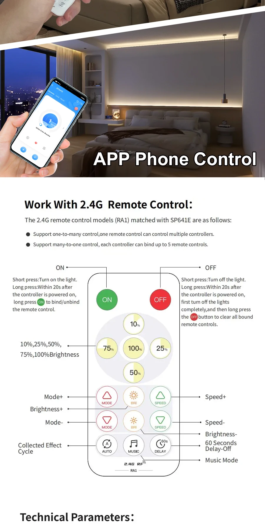 1. Connected by bluetooth, APP + RF remote + Music sync control.