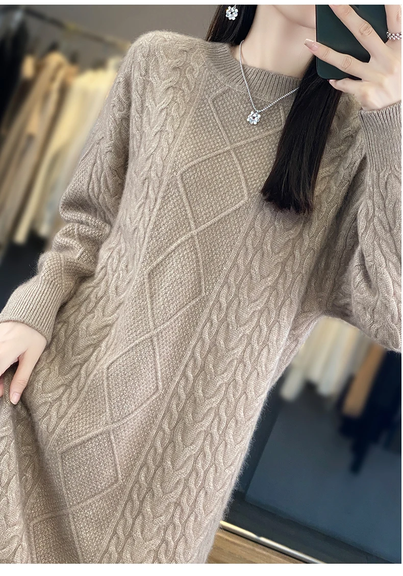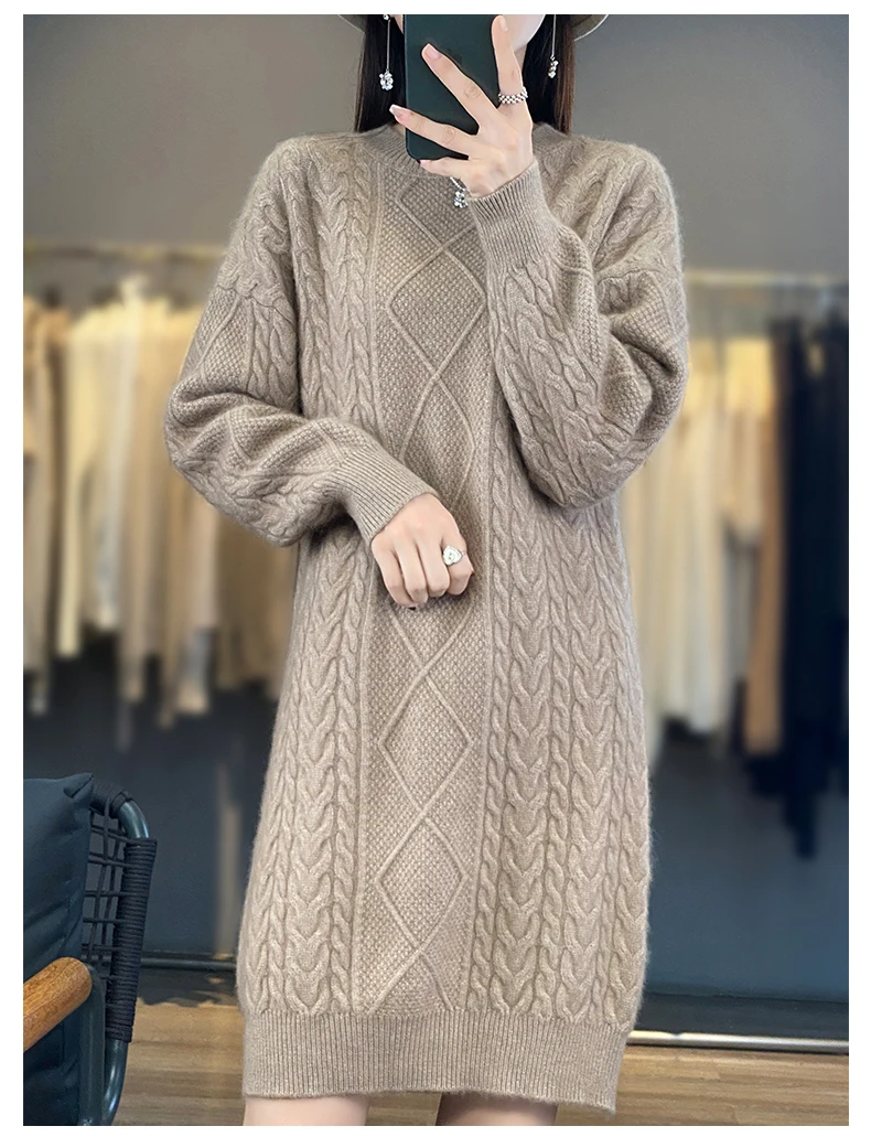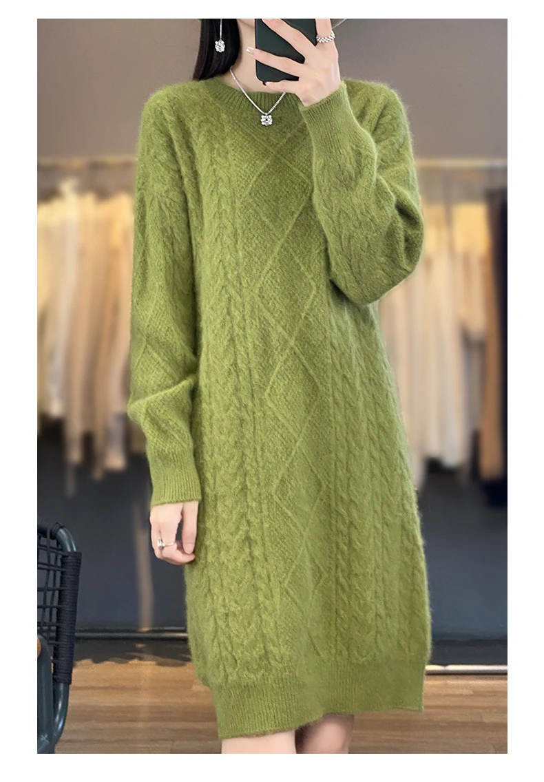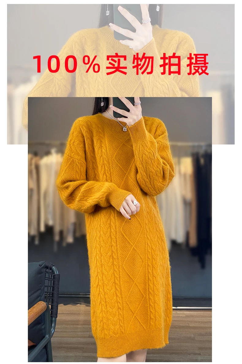 DjzDsm Women’s 100% Mink Cashmere women’s round neck Thick warm solid color knit dress
