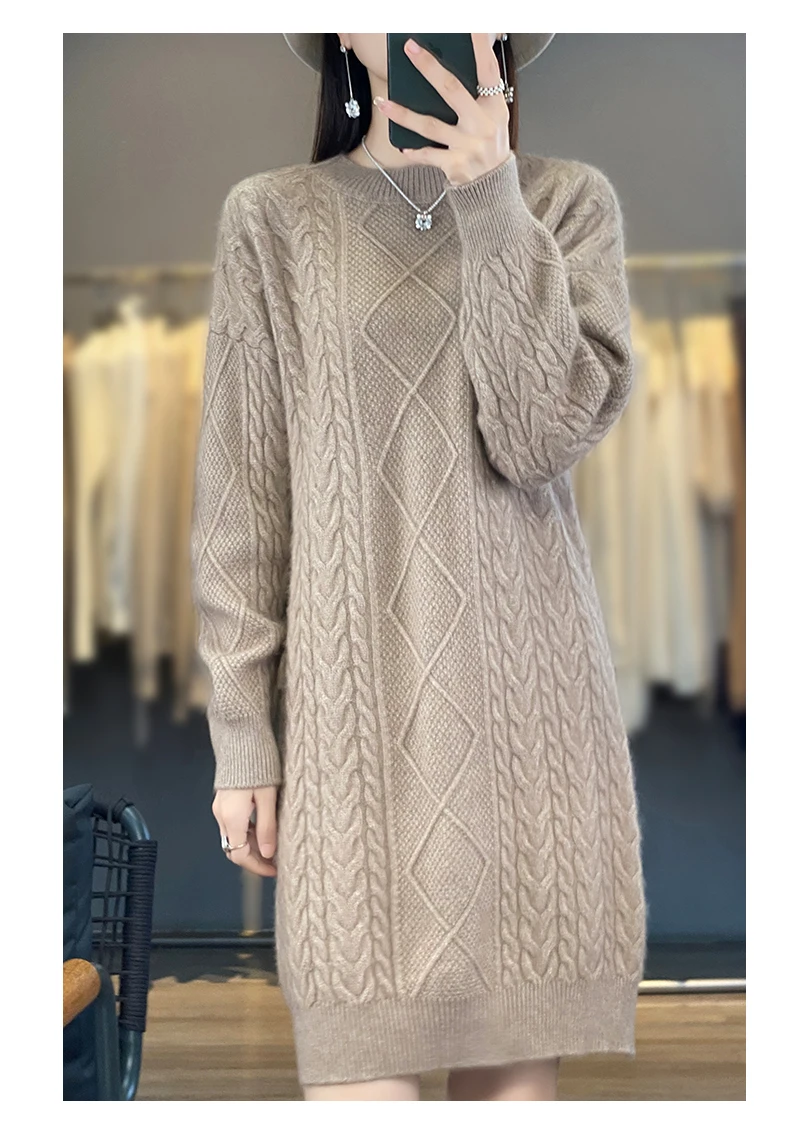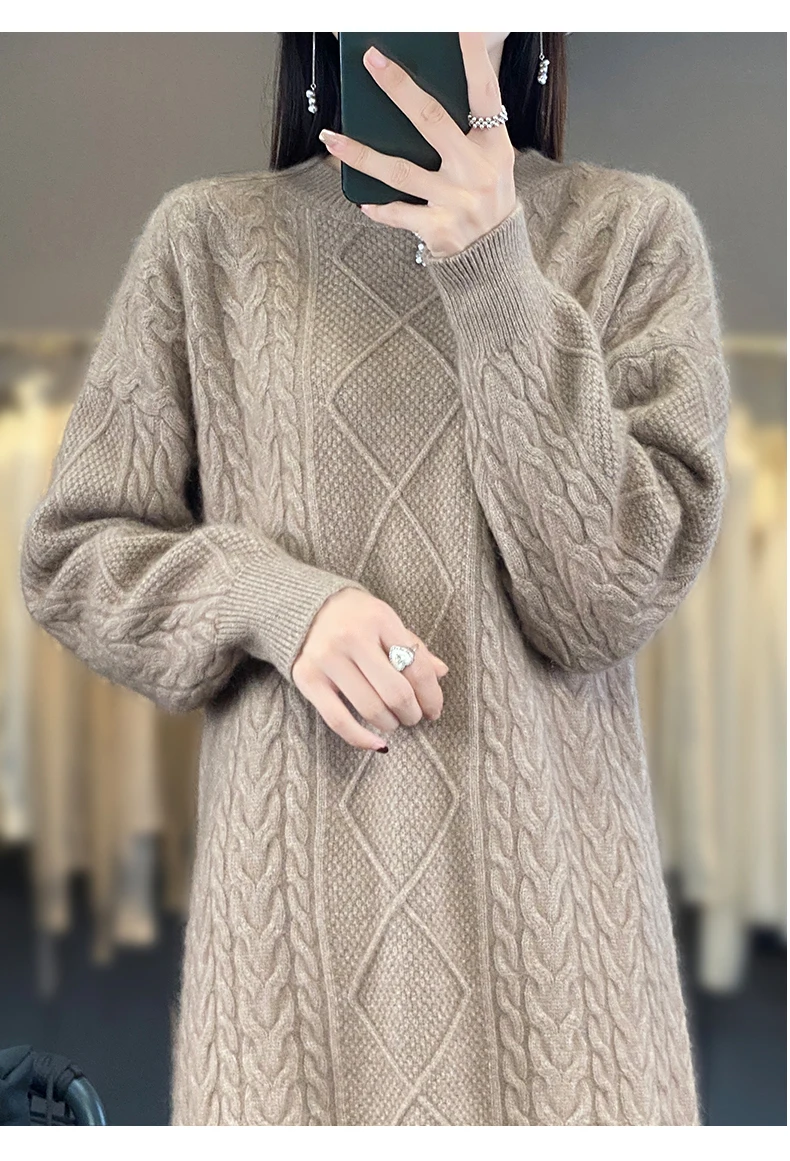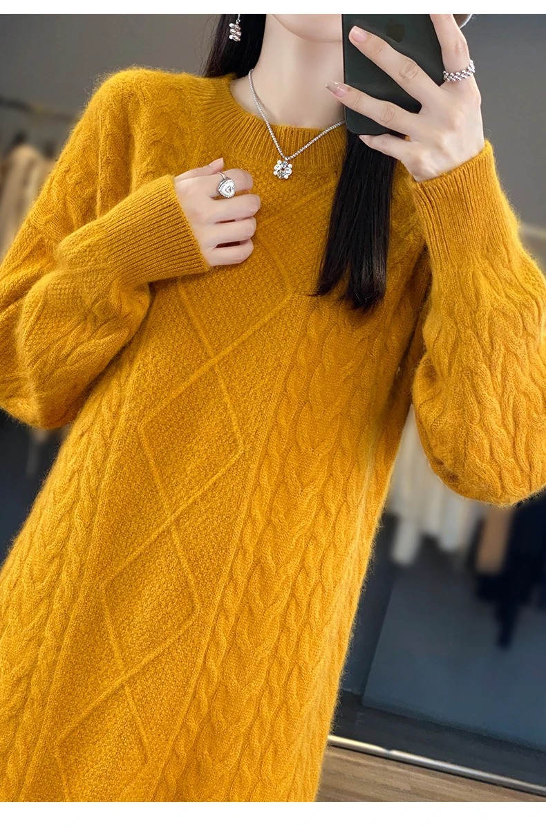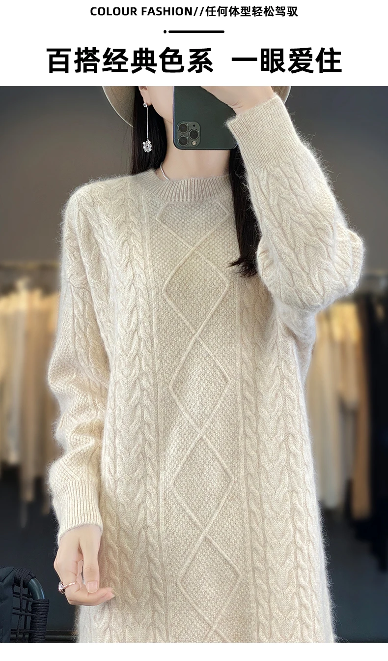 DjzDsm Women’s 100% Mink Cashmere women’s round neck Thick warm solid color knit dress
