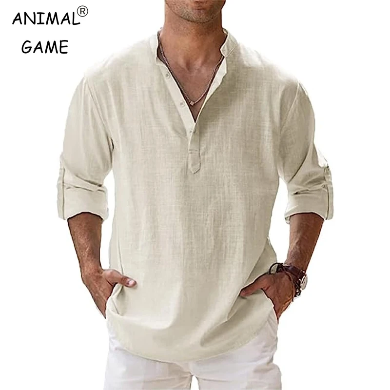 New Men’s Cotton T Shirts Linen Casual Long Sleeve Button Down Shirt Loose Collar Solid Color Tops S-5XL