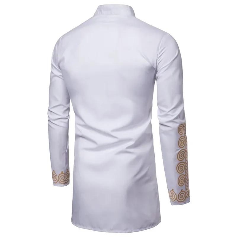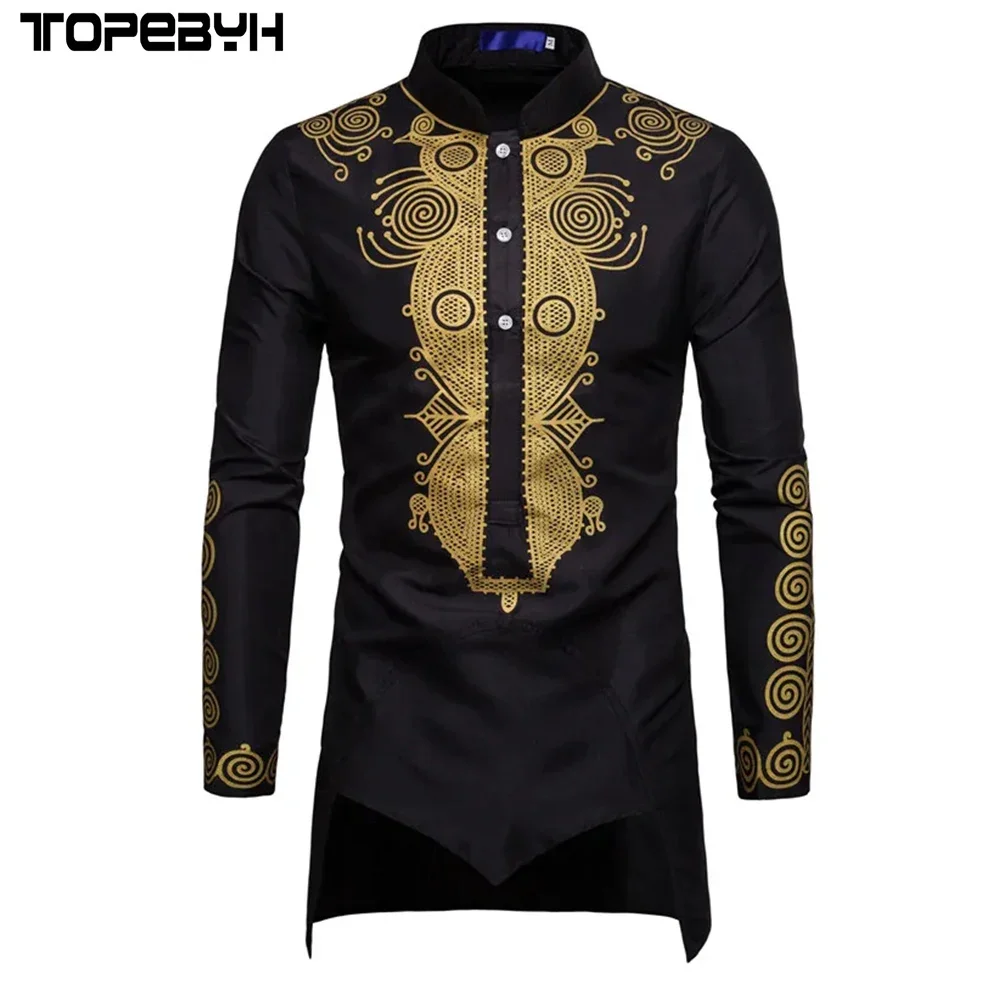 New Trend Thin Slim European Style Dress Men‘s Print Golden Flowers Long Sleeve Shirt Streetwear African