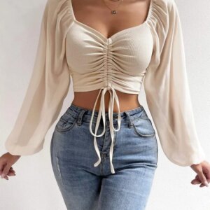 2023 Woman’s Tops Puff Sleeve Sexy Close-Fitting Summer and Spring Lace up V-neck Fashion Solid Color Simple Long Sleeve Hot